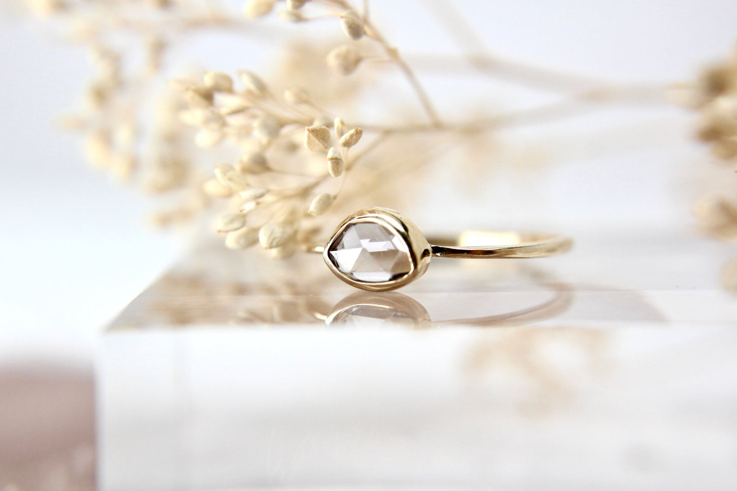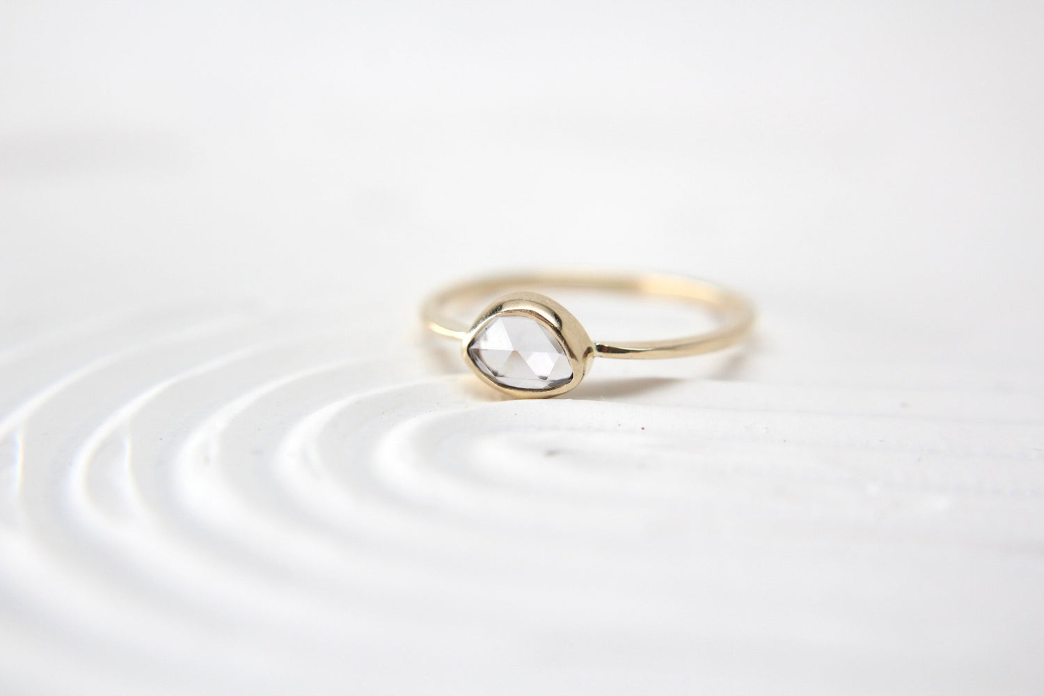 Stone sits in our signature flat top crescent band, called the Aubrey setting