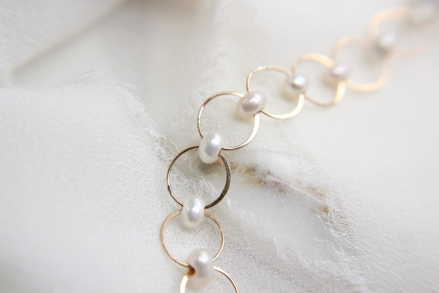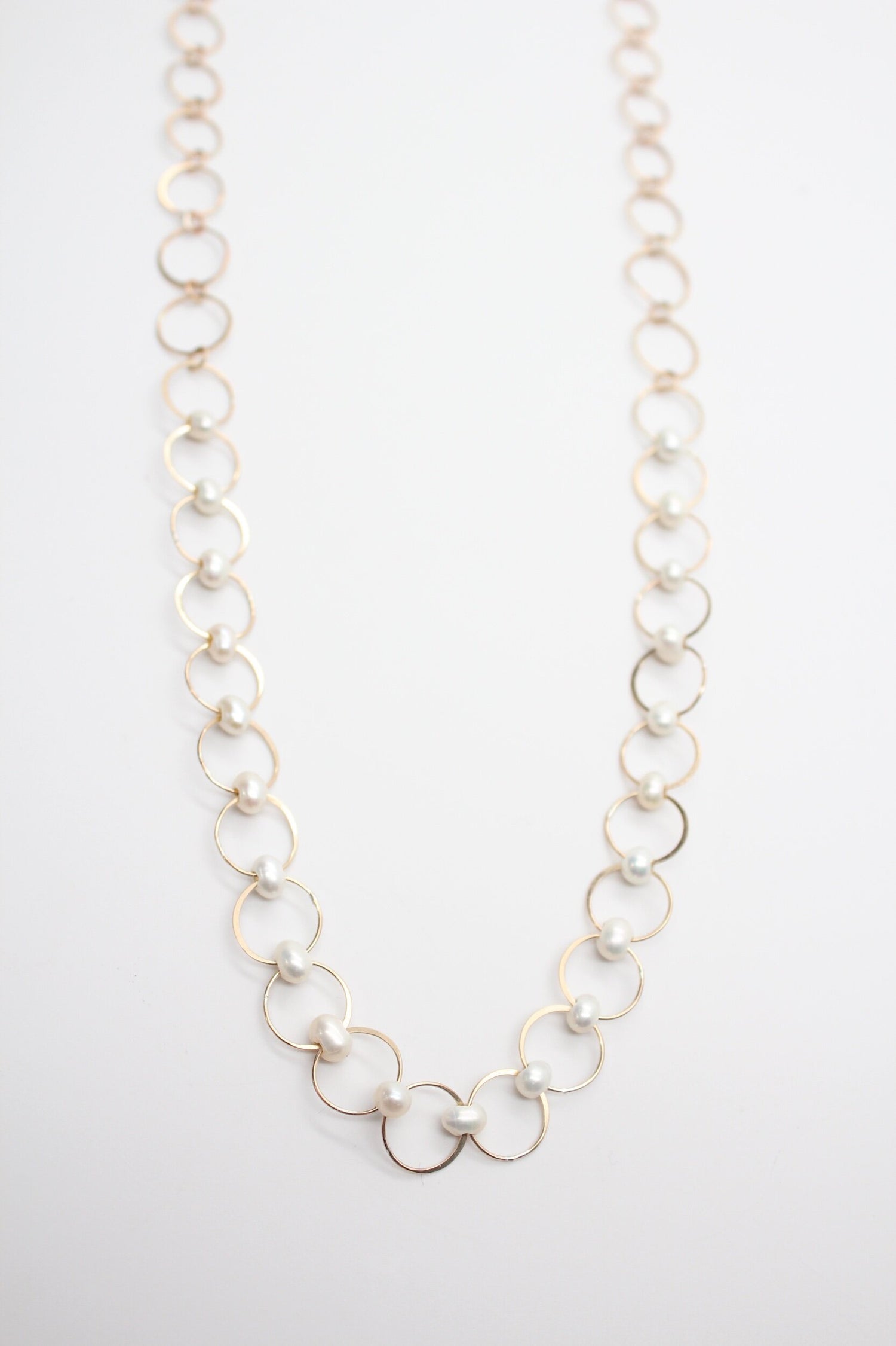 Each link is hand made and hand hammered, with 21 pearls and a graduating chain. At 18” long and adjustable to make shorter, its the perfect necklace to layer. You’ll always stand out with a piece like this, whether it’s your wedding day or your high energy work event.