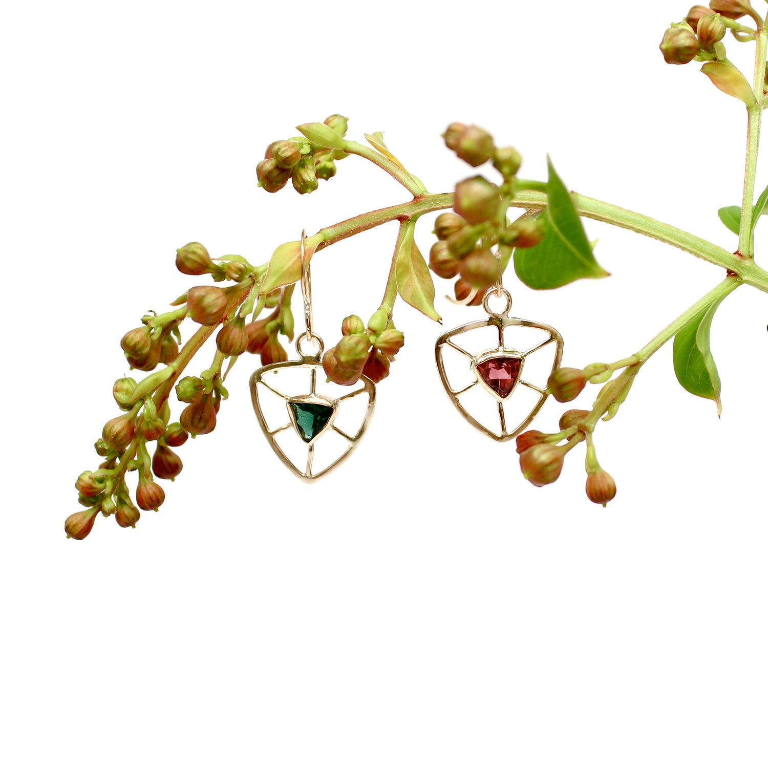 Mis-match "Lilliana" Trillion Earrings, with Pink and Green Tourmalines